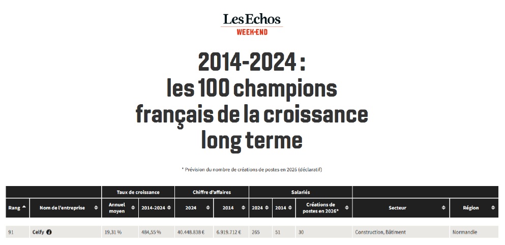Nouveauté cette année, Les Echos et Statista ont également fait un classement de la croissance long terme des 100 entreprises les plus dynamiques, entre 2014 et 2024. Celfy fait également partie du palmarès avec une croissance moyenne du chiffre d’affaires sur 10 ans de près de 20% l’an.